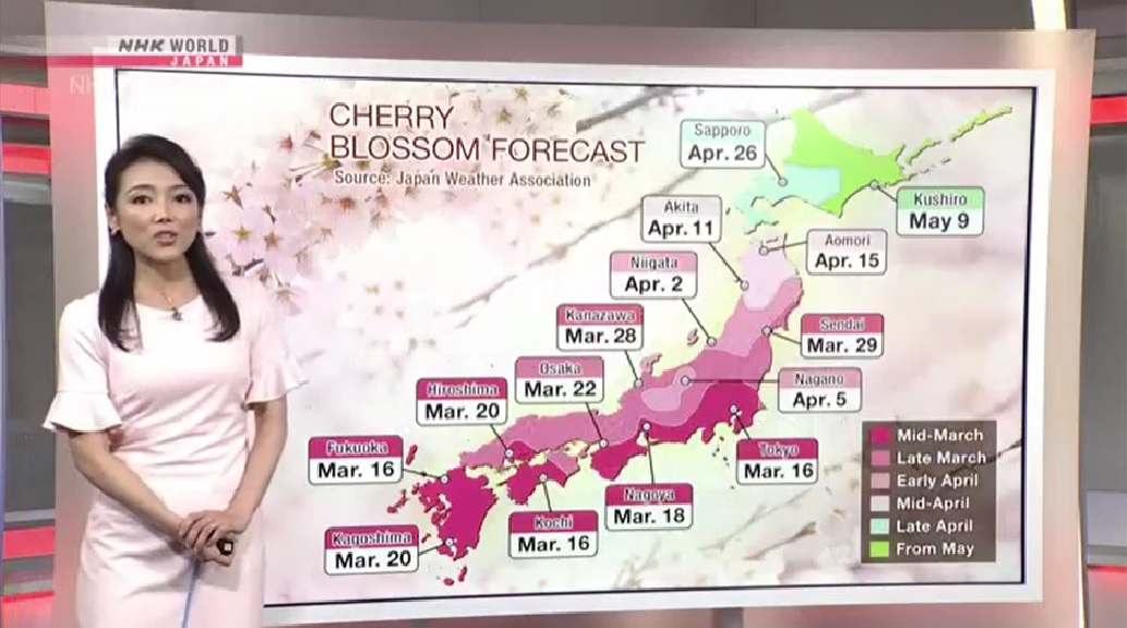Os meteorologistas japoneses acreditam que as flores de cerejeira irão atingir o pico de floração entre os dias 21 e 24 de março, entre a região sul e a região central do Japão.